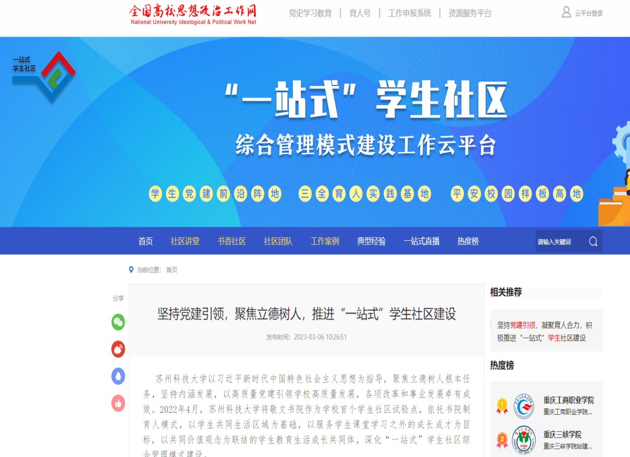 统筹协调,扎实推进社区育人工作。学校党委牵头各职能部门,成立“一站式”学生社区综合管理建设工作领导小组,将“一站式”学生社区综合管理建设工作作为校党委常委会、校长办公会重要议题,制定“一站式”学生社区运行方案,形成党委统一领导、有关单位各负其责、全员协同配合的工作格局。由学生工作部门牵头,其他相关部门相互沟通协同共建机制,定期召开领导小组会、工作推进会,领导小组负责协调社区运行,健全工作机制,划拨专项经费,从而形成全校共同推进学生社区管理服务体制机制。经过一年多建设,初见成效,相关建设成果被全国高校思想政治教育官网、江苏省教育厅官网专题报道。