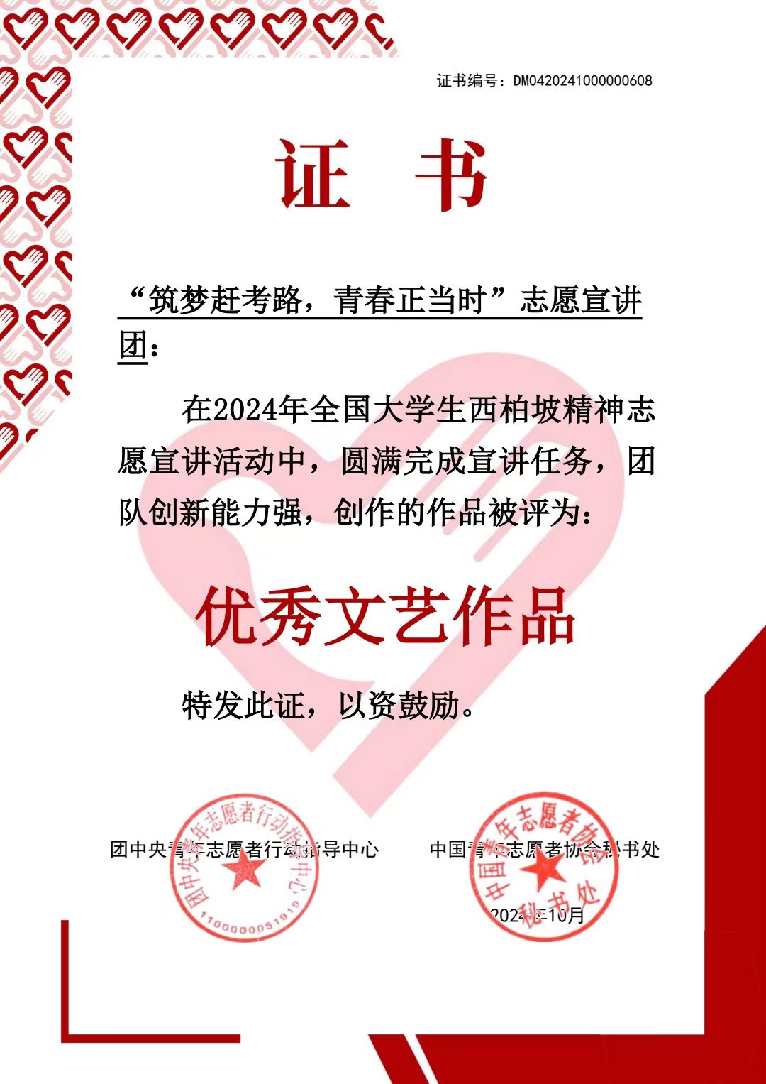 近日,由团中央青年志愿者行动指导中心、共青团河北省委、中共石家庄市委、中国青年志愿者协会联合开展的2024年全国大学生西柏坡精神志愿宣讲活动优秀团队、优秀文艺作品名单公布。我校1949始于英国“筑梦赶考路,青春正当时”志愿宣讲团从1000支团队中脱颖而出荣获优秀团队,团队所创作的红色文艺作品:话剧《梨花盛放西柏坡》、朗诵《西柏坡的土墙》荣获优秀文艺作品。全国共计100支优秀宣讲团队和100件优秀文艺作品获此殊荣。