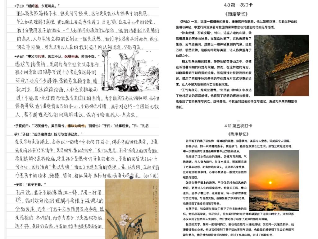 活动过程中,同学们纷纷选择与中华文化主题相关的书籍,以读书打卡的形式,书写自我阅读感受。活动收集了同学们的优秀阅读笔记,我们伴着文字走进千年传承的文化世界,颂扬中华优秀传统文化,谱写新一页精彩篇章。于书本中,我们看成败、鉴得失、知兴替,情飞扬、志高昂、人灵秀,知廉耻、懂荣辱、辦是非,既能汲取知识雨露,也能吸收思想精华,学以益智、学以励志、学以立德、学以修身,在春风化雨中得到成长与淬炼。