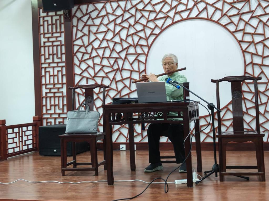 讲座中,周先生由《牡丹亭》的乐谱引入,深情并茂的介绍了《牡丹亭》的创作背景与故事概要,又用笛子吹奏《牡丹亭》的经典旋律,赢得满堂喝彩。周先生用幽默风趣的语言,从《游园》《惊梦》《寻梦》《离魂》《冥判》《冥誓》《还魂》七个片段分别讲述了杜丽娘对柳梦梅的深深情思,使同学们感受到了中国人对于爱情的含蓄与独有的浪漫主义想象力。