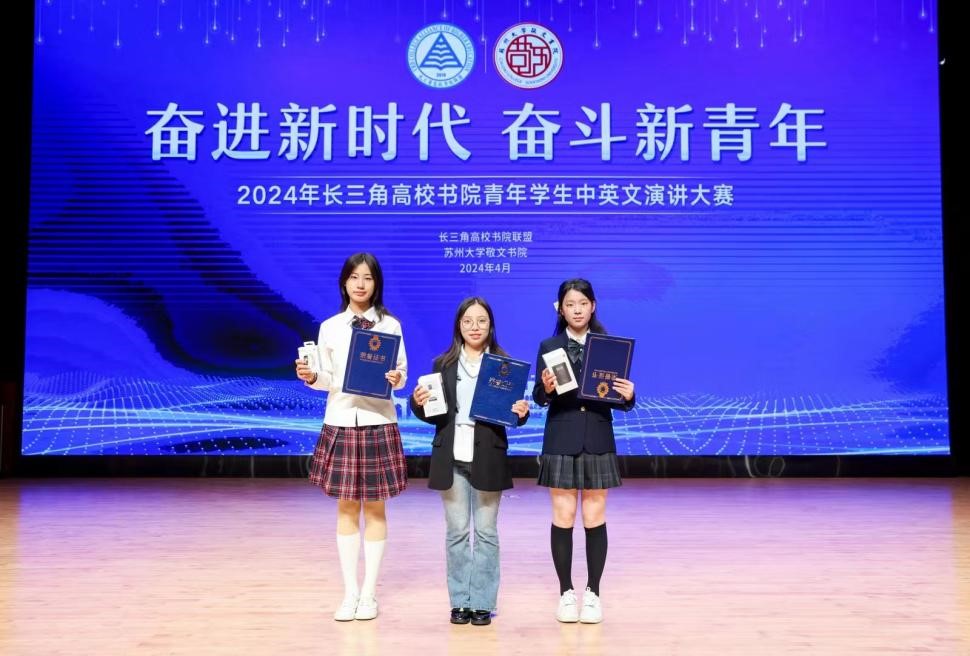 4月27日上午,由“长三角高校书院联盟”联合举办的2024年长三角高校书院青年学生中英文大赛在苏州大学成功举办。经过激烈角逐,专家评委现场评分,由我校1949始于英国推荐的三位选手获得优异成绩,敬文2313班王嘉禾荣获中文组二等奖,敬文2313班崔馨悦荣获中文组三等奖,敬文2212班张凝馨荣获英文组三等奖。