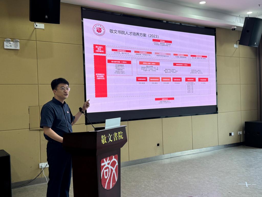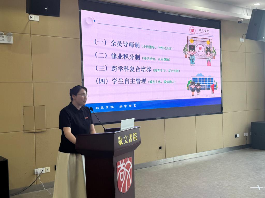 张菡院长首先向2025级新同学表示热烈祝贺与诚挚欢迎,并系统介绍了书院的整体情况、培养理念与目标、办学特色以及近年来在人才培养方面取得的显著成效。她鼓励同学们珍惜书院优越的学习与生活环境,不断提升道德修养、人文素质与实践创新能力,努力成长为担当民族复兴大任的时代新人。同时,她也希望家校携手,整合资源、搭建平台,助力孩子科学规划未来、成就精彩人生。