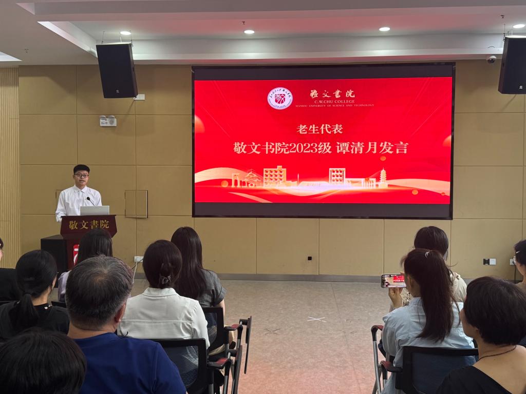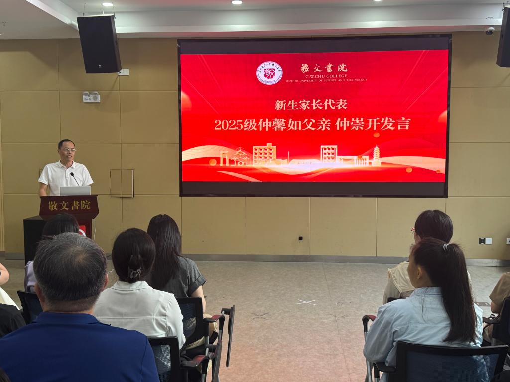 老生代表、2023级谭清月同学发言,他从专业学习、实践创新、文体活动、双院协同等方面分享了自身的学习生活经历,激励同学们要充分利用学校和书院提供的资源,勇敢地去尝试,去体验,去创造。新生家长代表、2025级仲馨如父亲仲崇开先生发言,他表示家长们将全力配合学校工作,共同为孩子们的成长成才保驾护航,希望同学们心怀感恩,珍惜时光;勤学修德,明辨笃实;学会独立,团结友爱。