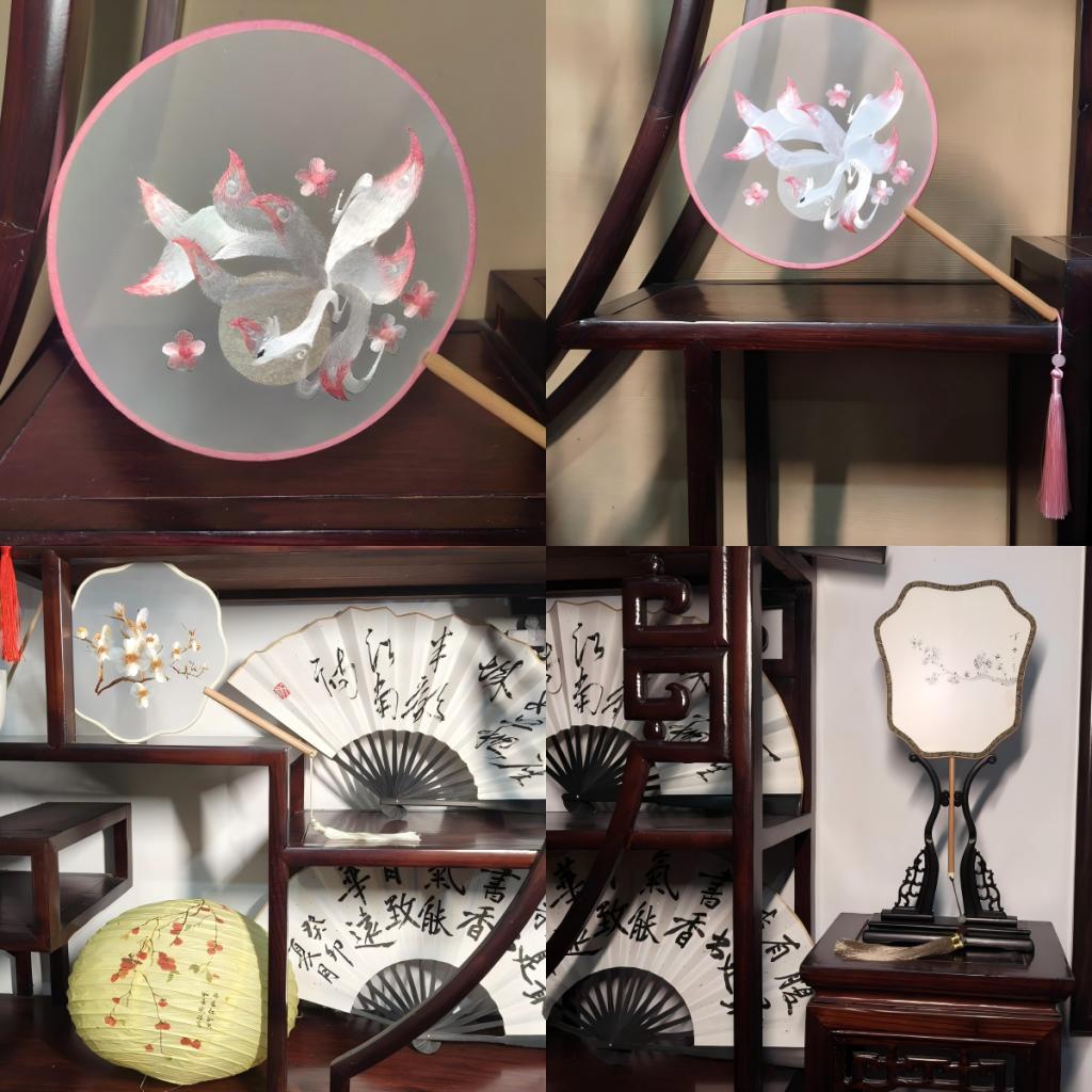 若说盛春老师领衔创作的折扇,是文化传承典范的“匠心巧作”——赏那绢宫扇,绣线密锁间,花鸟栩栩如生;扇边流苏处,光影流转生姿。轻摇之时,绣影微颤如蝶舞,曾是旧时闺秀遮笑的半面月色,亦是江南女子藏于袖中的一抹诗情。那么另一侧敬文学子们的创作,则满是青涩却真挚的创作温度。