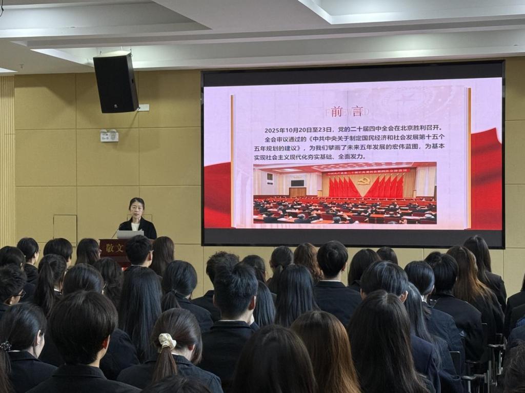 党课伊始,崔校长系统梳理了党的二十届四中全会的重大意义与核心内涵。她指出,于2025年10月在北京胜利召开的党的二十届四中全会,是一次在“十四五”规划即将收官、“十五五”规划即将启航的关键时期举行的具有承前启后意义的重要会议。全会审议通过的《中共中央关于制定国民经济和社会发展第十五个五年规划的建议》,为未来五年国家发展擘画了宏伟蓝图,是基本实现社会主义现代化征程上的关键指引。其中,特别强调了规范使用“党的二十届四中全会”全称的重要性,体现了政治表述的严肃性与准确性。
