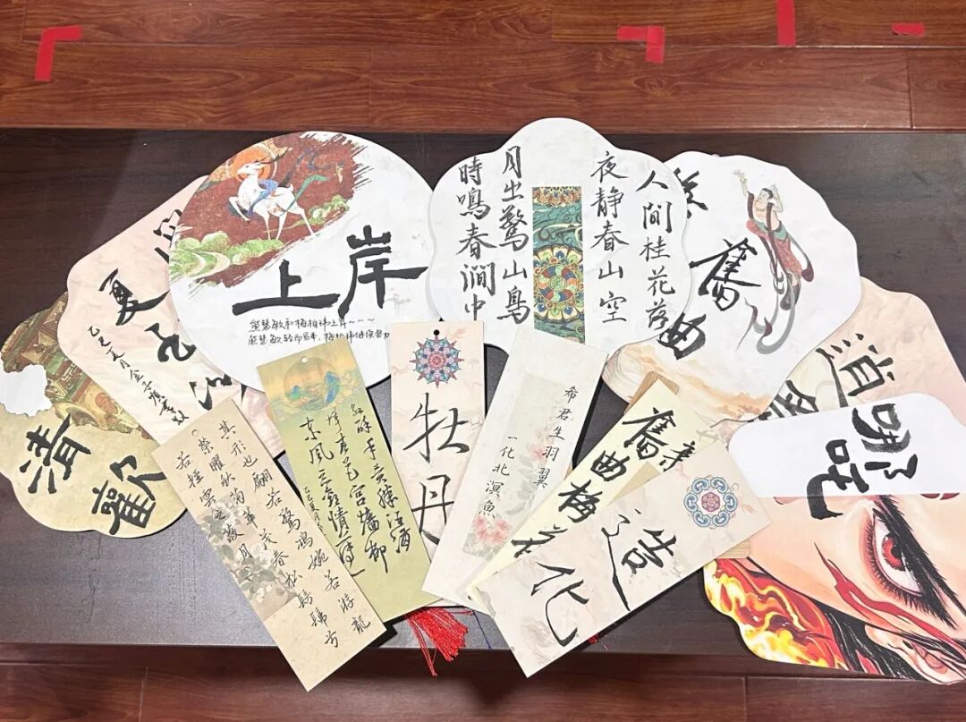 书法创作区则弥漫着雅致古韵。参与者们在国潮团扇、古风书签上挥毫泼墨,将非遗文化与实用物件完美结合。团扇上,“人闲桂花落,夜静春山空”等遒劲有力的诗句,搭配写意山水简笔,尽显东方美学意境;书签上,瘦金体、行楷等字体灵动飘逸,或书写传统谚语,或摘录经典词句,方寸之间尽显书法魅力。