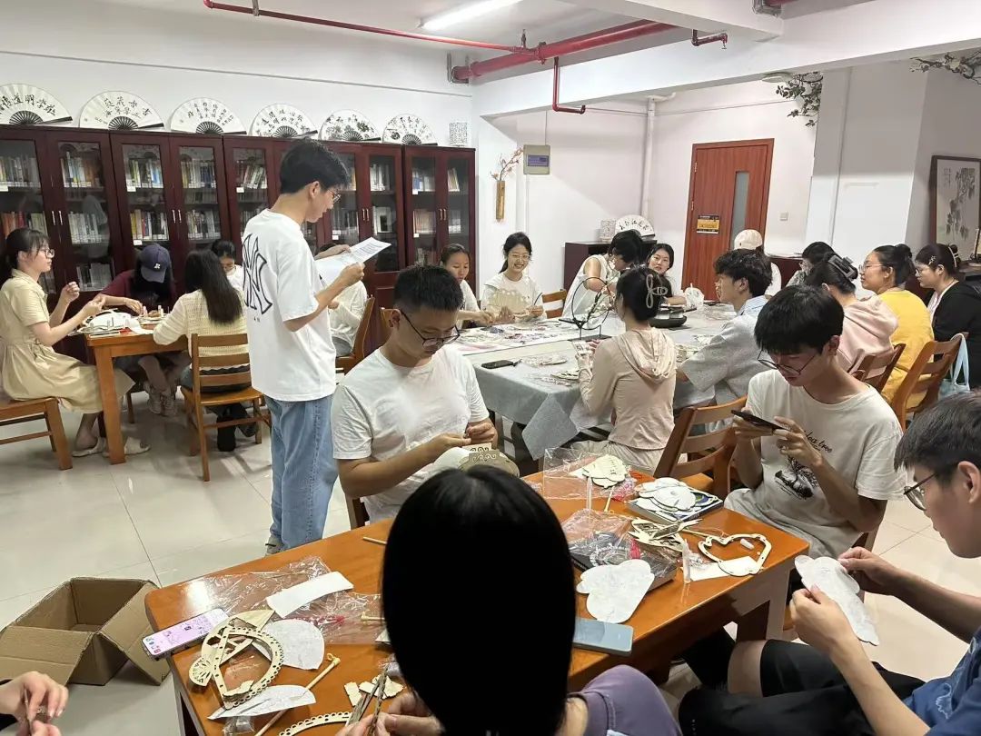 实践环节中,同学们热情高涨,纷纷化身 “非遗传承人”,亲手制作属于自己的花草灯。大家围坐在一起,相互交流、互相帮助,现场气氛热烈而温馨。有的同学发挥创意,在灯面上绘制出独特的图案;有的同学则专注于细节,将竹条打磨得光滑平整。随着一盏盏花草灯逐渐成型,阅览室里的光影愈发绚丽多彩。